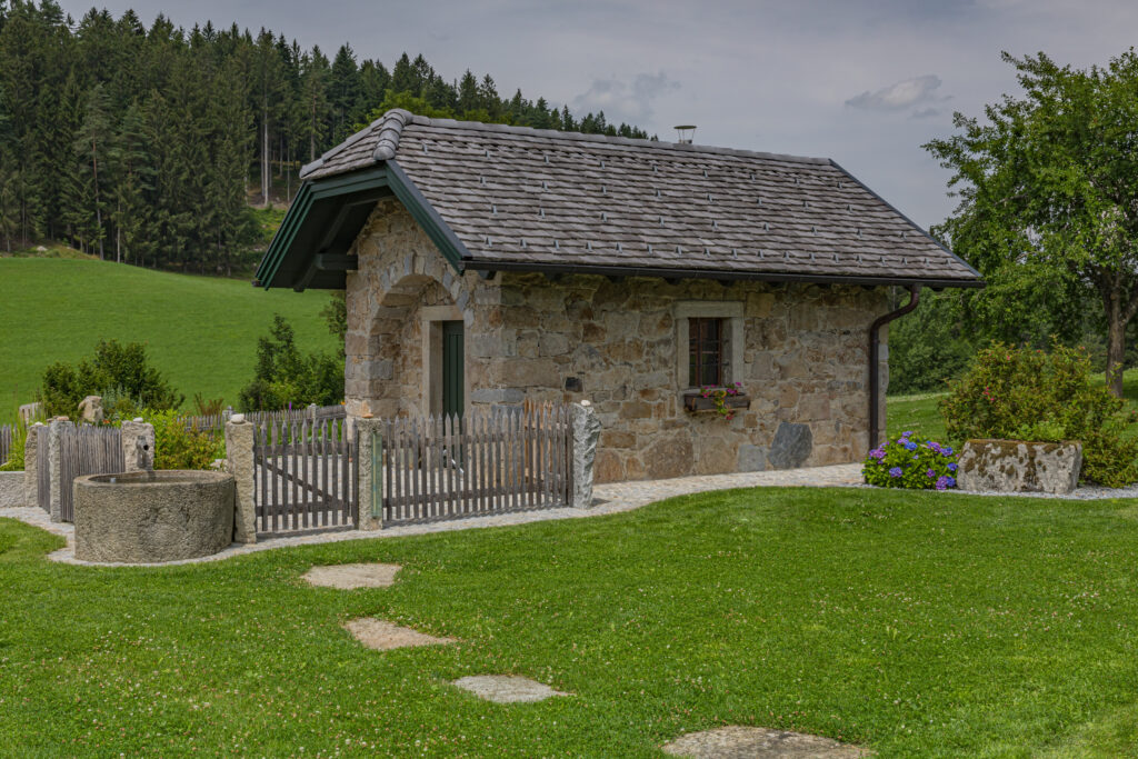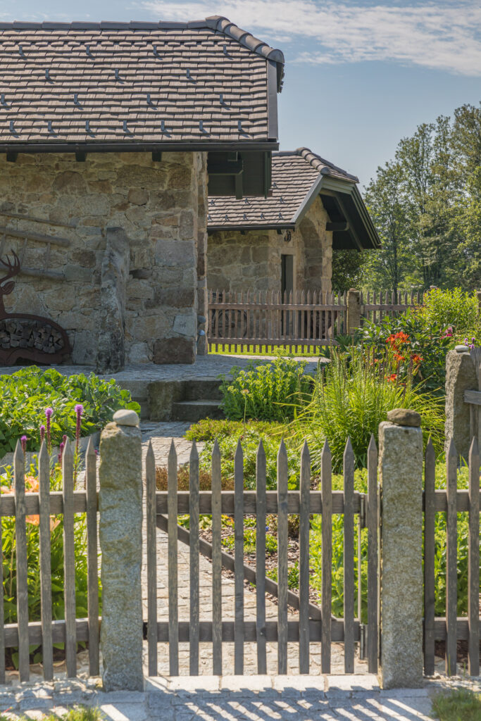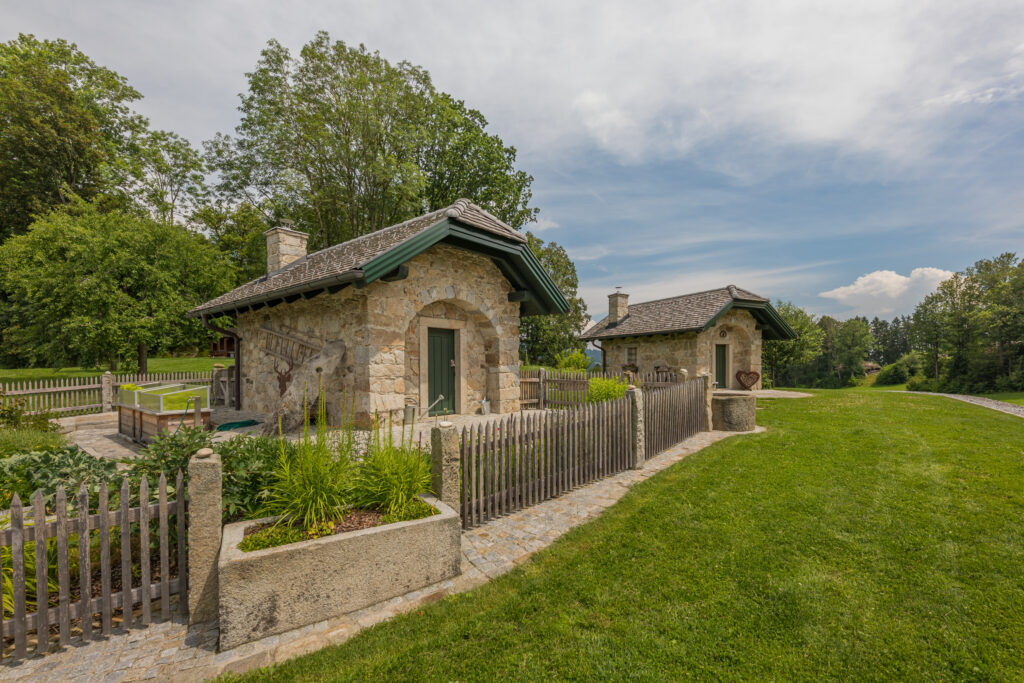 Gartenhäuser-Duo mit massiver Granit-Natursteinfassade.