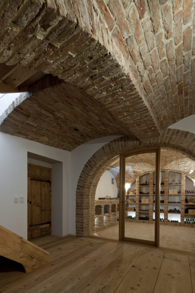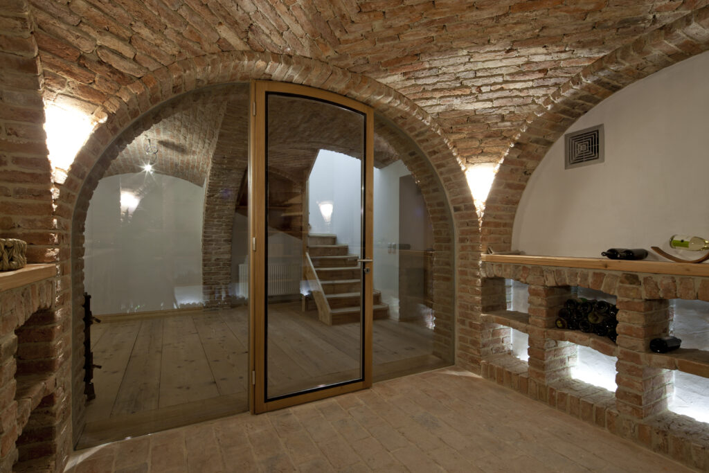 Weinkeller mit thermischer Trennung und Rundbogen. Böhmisches Platzlgewölbe gemauert mit antiken Ziegeln in Sichtausführung. Weinlagerkonzept mit Weinregalen.