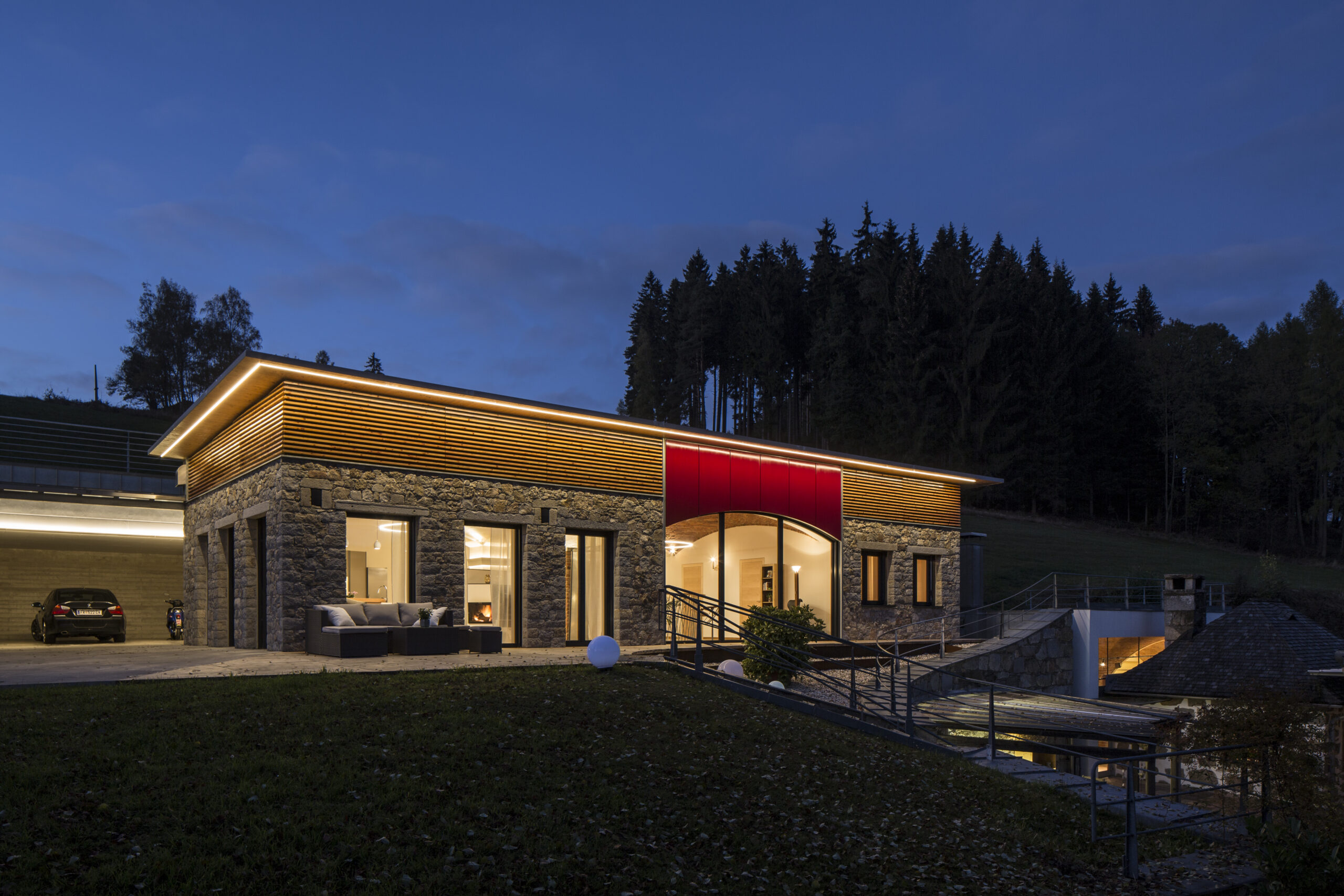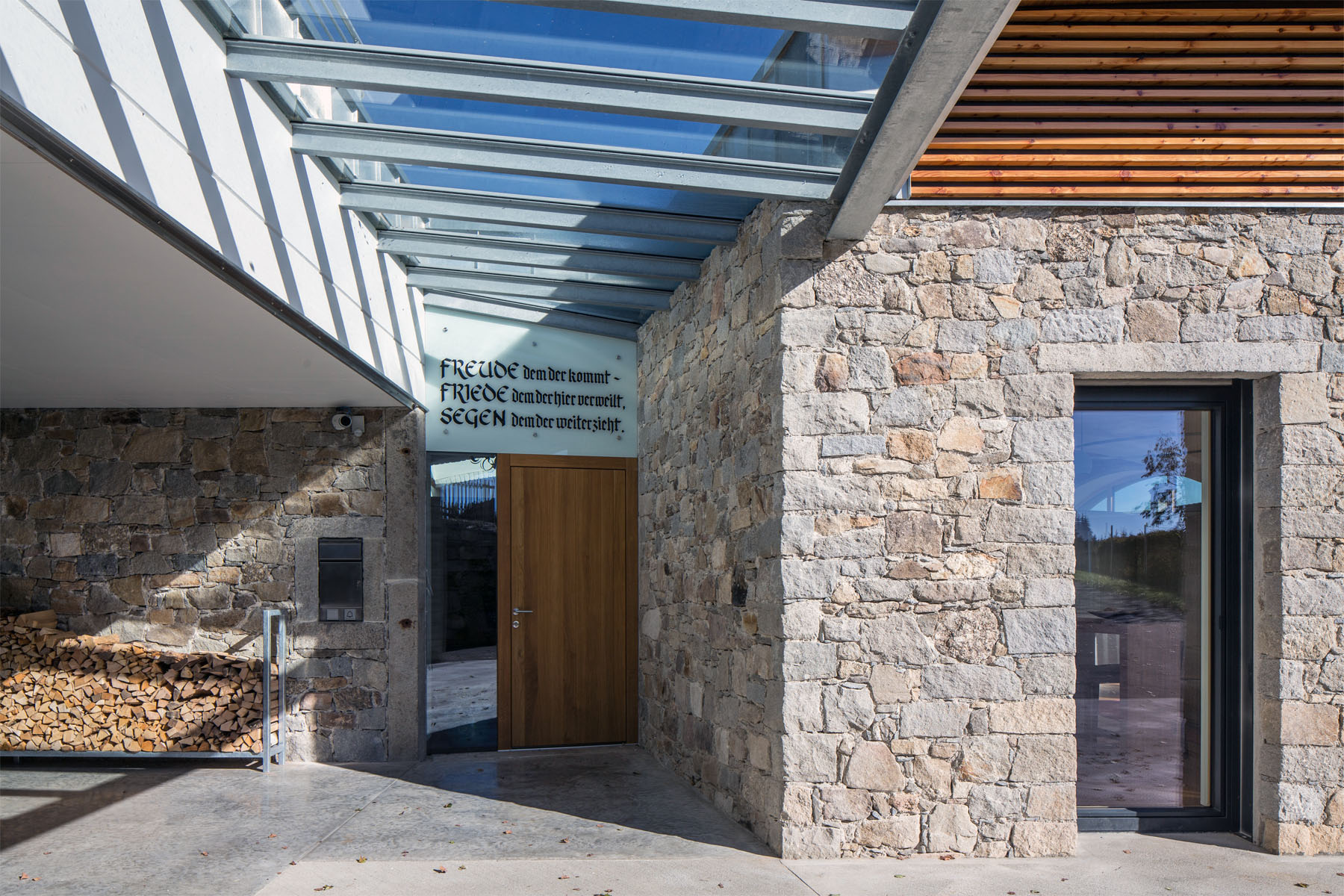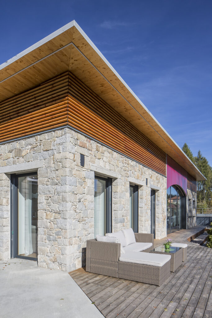 Natursteinfassade aus Mühlviertler Granit an modernem Wohnhaus mit mediterranem Flair.